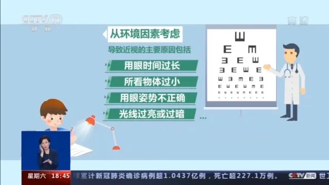 而从环境因素考虑,导致近视的主要原因包括近距离用眼时间过长,所看物体过小,用眼姿势不正确,以及光线过亮或过暗等。