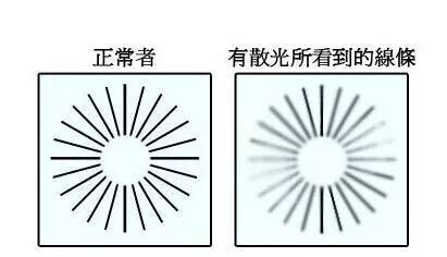 正常的人看到的图像每条线长短、粗细都是统一的,而眼部有散光的人,会看到有某些线条格外清晰。